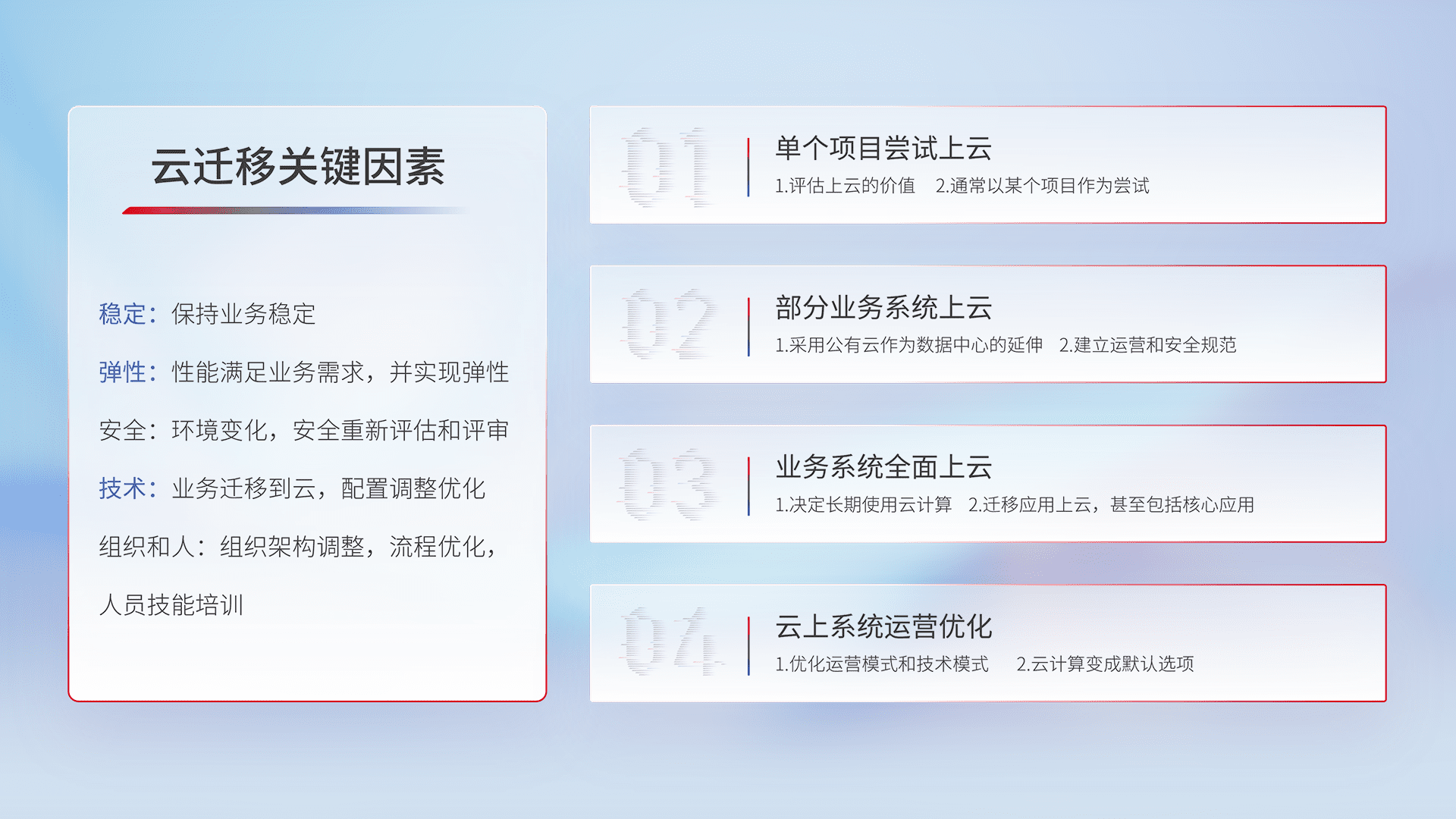 结合实际业务,,从规划设计、、、、云平台选型、、、云原生改造、、、、数据迁移、、、集成交付,,,迁移全过程为客户识别最佳上云路径,,,,做好风险识别管理,,,设计网络架构、、身份权限、、、安全审计合规、、、操作审计、、日志审计、、、监控告警策略、、、、多站点容灾设计等,,,,对云上基础设施进行整体规划,,提升IT治理水平,,,,以满足弹性、、高可用、、高性能的需求。。。。