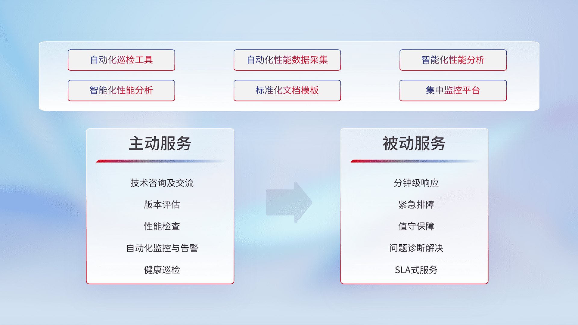 智能化工具和标准化文档,,保障服务质量,,提供主动服务(包含技术咨询、、、、版本评估、、、性能检查、、自动化监控与告警、、、、健康巡检)和被动服务包含(分钟级响应、、、紧急排障、、值守保障、、、问题诊断解决、、、、SLA服务)。。